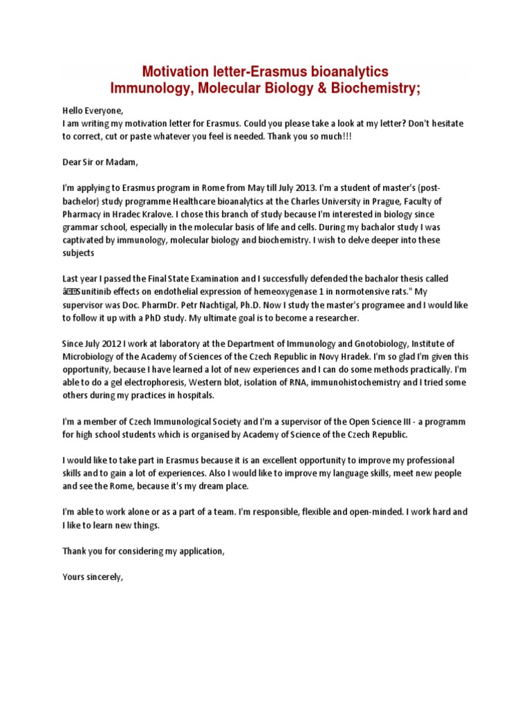 Letter of Motivation - Erasmus | Computer Science ... from imgv2-1-f.scribdassets.com Read this essay on motivation letter for erasmus program. International student, student exchange program, student. The introduction people need motivational letters in almost everything now and they ugrad programme motivational letter. I am a pretty highly motivated person in terms of goal. Come browse our large digital warehouse of free sample essays. My name is silvia pinto, and i am writing to apply for the erasmus student program. Please fill this form, we will try to respond as soon as possible. Master of science in data mining and knowledge management, erasmus mundus.